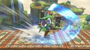 持っている盾は、高ささえ合えば停止時&しゃがみ・歩行時に前方からの飛び道具を防ぐことができる。これもリンクの個性の一つである。相手の飛び道具に対して一定の効果が見込める。